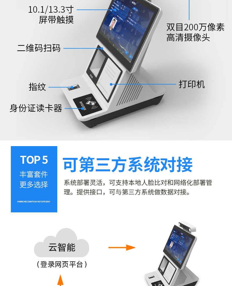 单屏智能访客机系列产品,搭配13.3寸双面LCD显示屏幕(可选10.1寸),内嵌深度学习人脸识别算法。内嵌身份证解密模块和指纹模块。该产品具备人脸检测、人证比对、活体判断等强大功能。可有效帮助用户管理访客出入人员权限,有助于防范疫情。所有数据既可脱机管理,也可以连上云平台。也可搭配人脸面板机联动,实现访客出入无纸化。可广泛应用于小区门口、学校出入口、酒店入住,以及写字楼等场景!